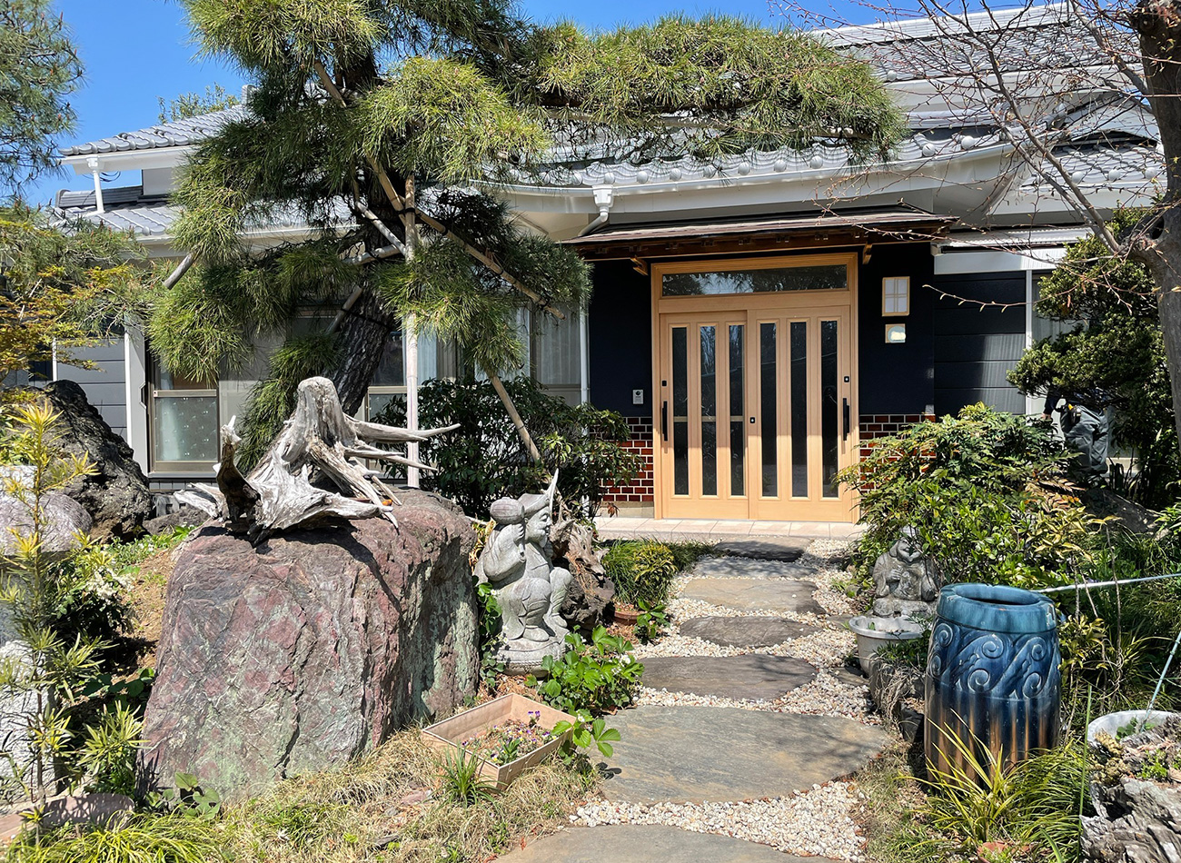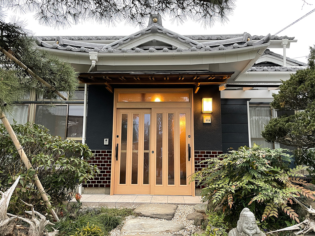 建物の軒先が反っているため、玄関周りに工夫が必要でしたが、うまく調整できました。