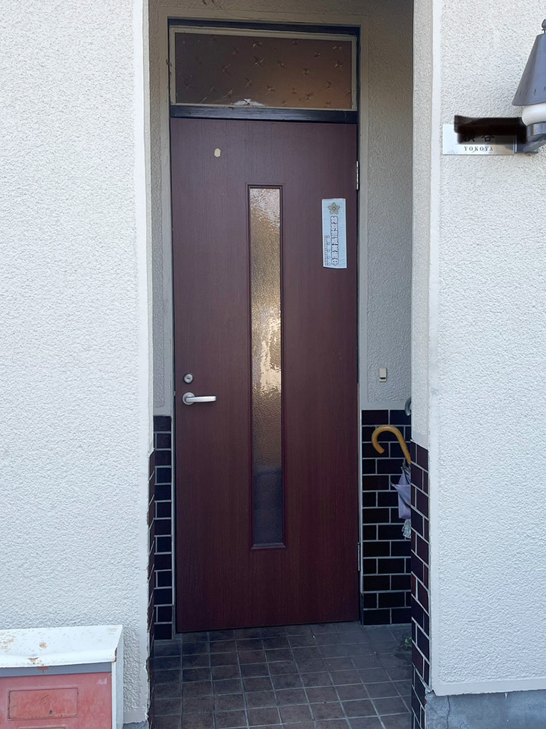 シロアリの虫害にあって、玄関ドアの枠がスカスカになってしまったドアの交換工事です。